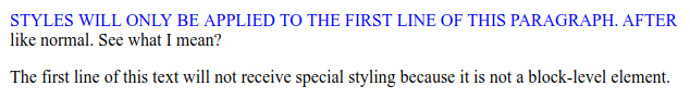 Псевдокласс ::first-line применяет стили к первой строке элемента уровня блока.