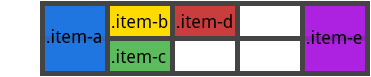 Так как мы установили grid-auto-flow в row, наша сетка будет выглядеть как на изображении ниже. Обратите внимание на то, как три элемента которые мы не расположили (item-b, item-c и item-d) перетекают через пустые строки: