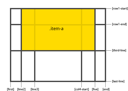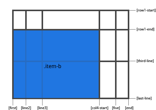 Свойство grid-column-start определяет местоположение в сетке ссылаясь на конкретные линии. grid-column-start / grid-row-start — это линия с которой начинается элемент.
