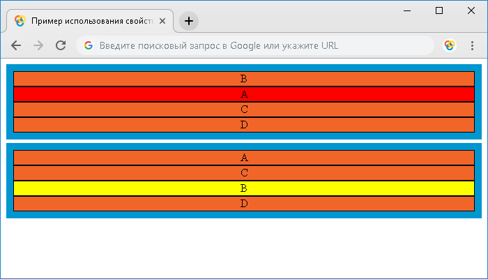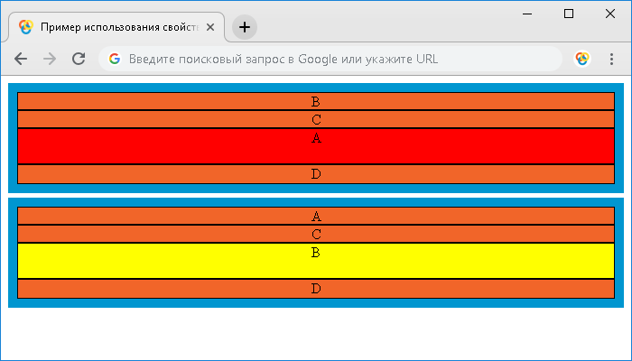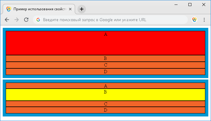 В этом примере мы разместили два блочных grid-контейнера, внутри которых мы разместили по четыре элемента <div>. С помощью свойства grid-template-rows мы указываем четыре значения, которые определяют, что мы размещаем четыре строки, используя значение auto, которое в зависимости от размера контейнера и размера содержимого элемента в строке, определяет размер строки. Кроме того, для каждой строки мы задаем уникальное имя.