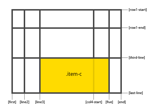 line-name- строковое значение ссылающееся на именованную строку в макете сетки. Элемент располагается от начальной грани указанного элемента.