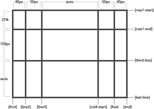 Обратите внимание на то что у линии может быть несколько названий. Например, здесь у второй линии будет два названия: row1-end и row2-start: