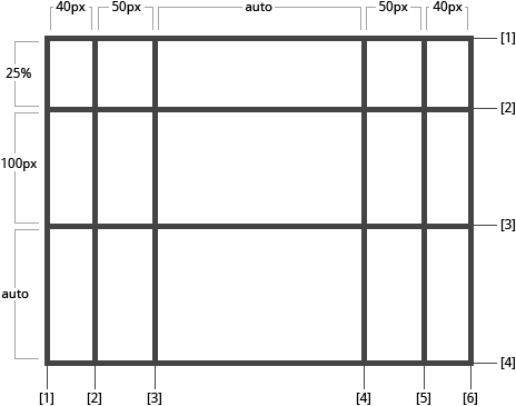 Свойство grid-template-rows определяет строки сетки с помощью списка значений разделённого пробелами. Значения представляют из себя размер трека, а пробелы между ними представляют линии сетки.