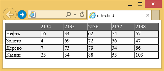 В данном примере псевдокласс :nth-child используется для изменения стиля первой строки таблицы, а также для выделения цветом всех чётных строк (рис. 1).