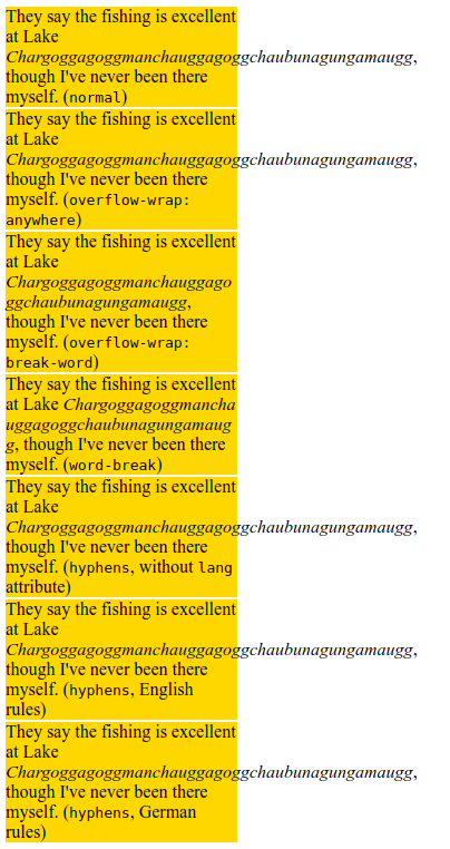 Во избежание переполнения неразрывная строка символов - например, длинное слово или URL-адрес - может быть разбита в любой точке, если в строке нет других приемлемых точек разрыва. В точке останова символ переноса не вставляется. Возможности мягкого переноса, представленные разрывом слов, учитываются при расчете собственных размеров минимального содержимого.
