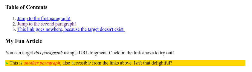 <h3>Table of Contents</h3><ol><li><ahref="#p1">Jump to the first paragraph!</a></li><li><ahref="#p2">Jump to the second paragraph!</a></li><li><ahref="#nowhere">This link goes nowhere, because the target doesn't