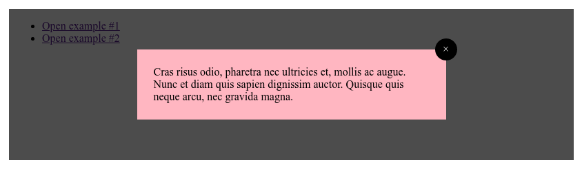 <ul><li><ahref="#example1">Open example #1</a></li><li><ahref="#example2">Open example #2</a></li></ul><divclass="lightbox"id="example1"><figure><ahref="#"class="close"></a><figcaption>