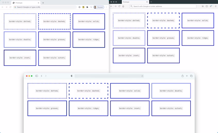 Поведение браузеров может отличаться и для других стилей границ, поэтому важно протестировать свой сайт в разных браузерах. Частым примером такого различия является то, как каждый браузер отображает стили dotted и dashed.