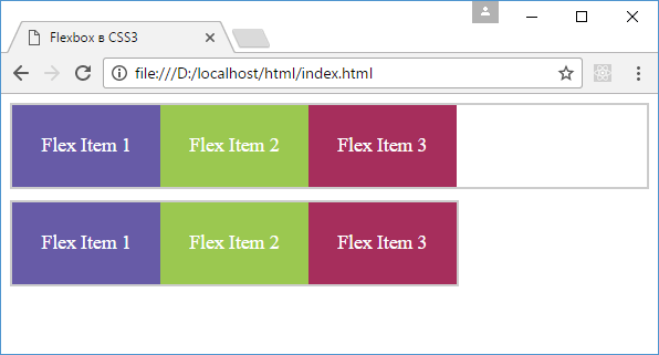 В частности, в первом случае flex-контейнер растягивается по ширине страницы, а во втором случае занимает именно столько места, сколько необходимо для flex-элементов.
