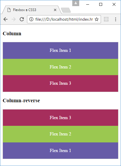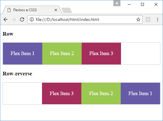 row: значение по умолчанию, при котором элементы располагаются в виде строки слева направо row-reverse: элементы также располагаются в виде стоки только в обратном порядке справа налево column: элементы располагаются в столбик сверху вниз column-reverse: элементы располагаются в столбик в обратном порядке снизу вверх Например, расположение в виде строки: