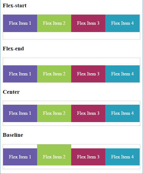 flex-start: элементы выравниваются по верхнему краю (при расположении в строку) или по левому краю (при расположении в столбик) flex-контейнера