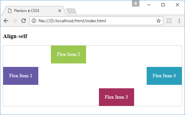 Свойство align-self позволяет переопределить значение свойства align-items для одного элемента. Оно может принимать все те же значения плюс значение auto: