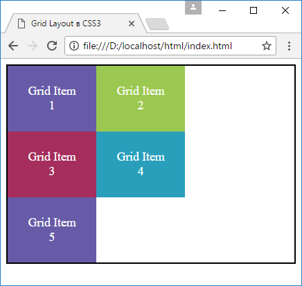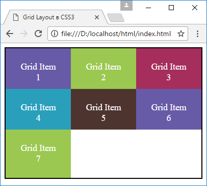 В то же время, если элементов больше, чем ячеек грида, то образуются дополнительные строки (как в случае со столбцами). Поэтому, несмотря на то, что выше были определены настройки только для двух строк, в реальности строк в гриде будет три строки, причем, как видно на скриншоте, высота третьей строки необязательно будет 5em, как у других строк, она будет вычисляться автоматически.