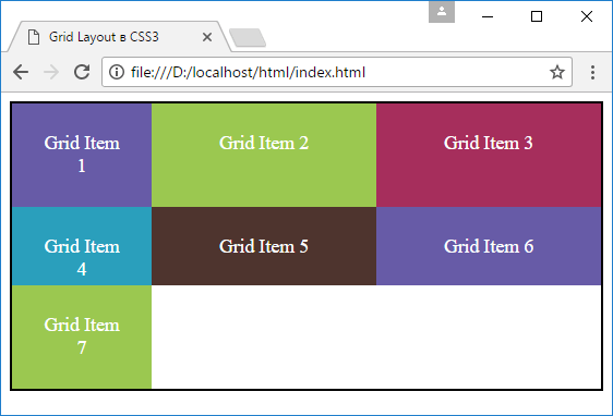 В примерах, которые были рассмотрены в предыдущих статьях, ширина столбцов и длина строк устанавливались на основании фиксированных значений, которые передаются свойствам grid-template-columns и grid-template-rows. Для определения размеров мы можем использовать самые различные единицы измерения, которые нам доступны в CSS (px, em, rem, pt, %), например: