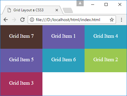 Свойство order позволяет задать порядок элементов. По умолчанию для каждого элемента в гриде это свойство имеет значение 0. Поэтому элементы располагаются друг за другом как они определены в разметке html. Но мы можем переопределить этот порядок: