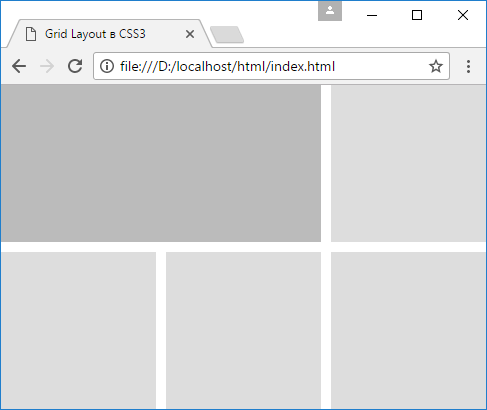 <!doctype html><html><head><metacharset="utf-8"/><metaname="viewport"content="width=device-width"/><title>Grid Layout в CSS3</title><style>*{box-sizing:border-box;}html,body{margin:0;padding:0;}.grid-container{height:100vh;display:grid;grid-template-columns:[col1start]1fr[col1end]10px[col2start]1fr[col2end]10px[col3start]1fr[col3end];grid-template-rows:[row1start]1fr[row1end]10px[row2start]1fr[row2end];}.grid-item{background-color:#ddd;}.special-item{grid-column:col1start/col2end;grid-row:row1start;background-color:#bbb;}.item1{grid-column:col3start/col3end;grid-row:row1start;}.item2{grid-column:col1start/col1end;grid-row:row2start;}.item3{grid-column:col2start/col2end;grid-row:row2start;}.item4{grid-column:col3start/col3end;grid-row:row2start;}</style></head><body><divclass="grid-container"><divclass="grid-item special-item"></div><divclass="grid-item item1"></div><divclass="grid-item item2"></div><divclass="grid-item item3"></div><divclass="grid-item item4"></div></div></body></html>
