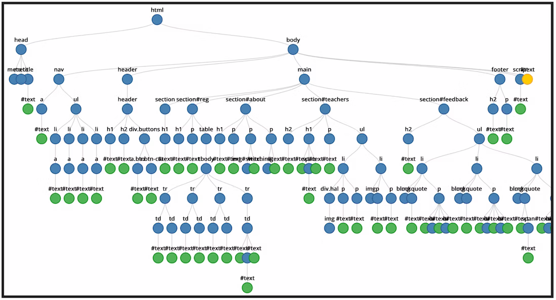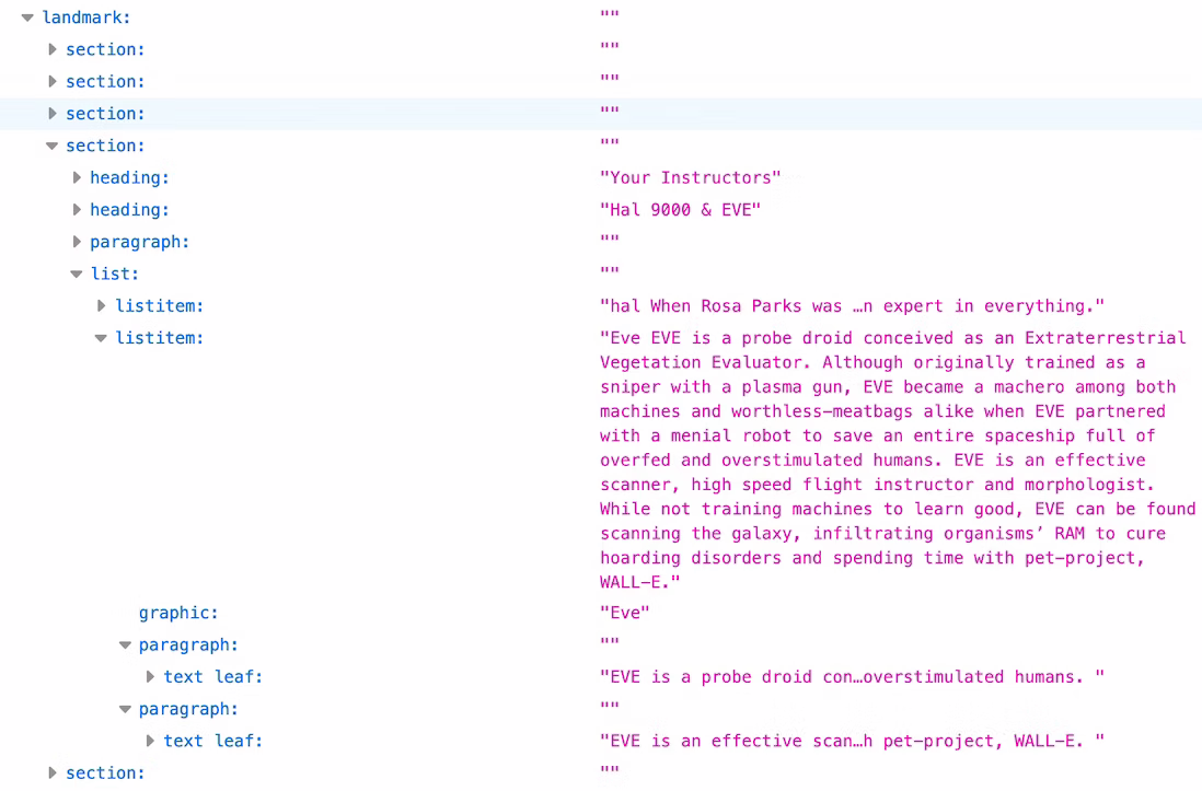 Древовидное представление, которое можно проверить в инструментах разработчика браузера, - это дерево доступности. AOM основан на DOM; аналогичным образом дерево доступности содержит объекты, представляющие все элементы разметки, атрибуты и текстовые узлы: