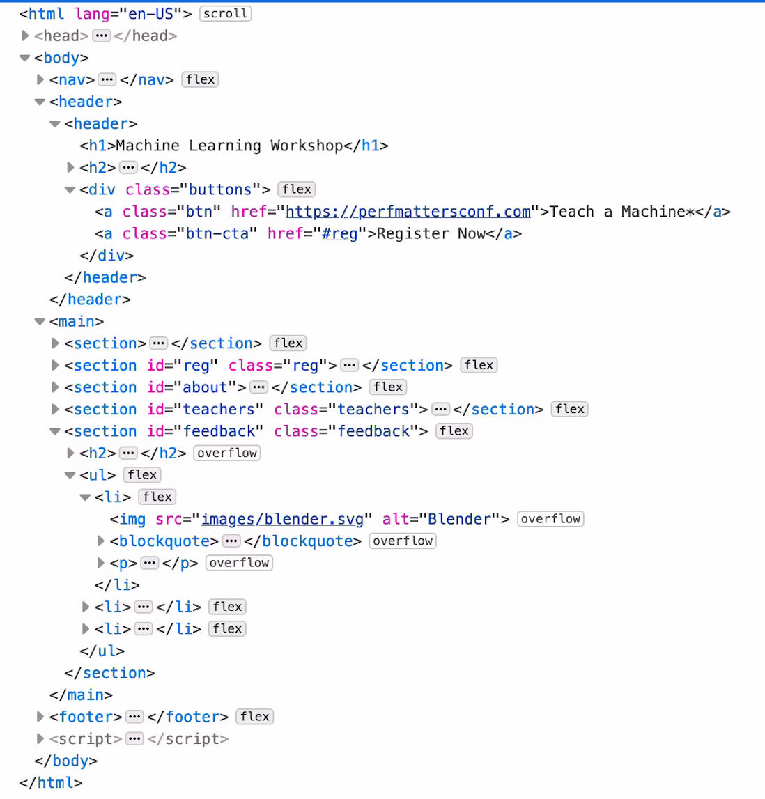 Более 30 элементов не имеют связанного с DOM интерфейса, отличного от HTMLElement, включая <address>, <article>, <section>, <nav>, <header>, <footer>, <aside> и <hgroup>. Многие элементы, которые не поддерживают никаких не устаревших, не глобальных атрибутов, имеют специфические интерфейсы, такие как HTMLPElement (элемент <p>) и HTMLUnknownElement (<😃> или любые другие элементы, которые не определены), но эти интерфейсы не реализуют никаких дополнительных свойств или методов поверх свойств и методов, унаследованных от HTMLElement, и не перечислены выше.