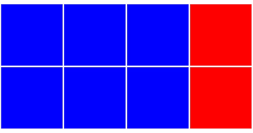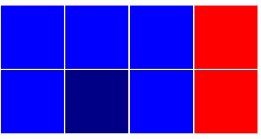 Первая строка, первый столбец - #0000FF. Первая строка, второй столбец - #0000FF. Строка один, столбец три - #0000FF. Первая строка, четвертый столбец - #FF0000. Вторая строка, первый столбец - #0000FF. Строка два, столбец два - #000085. Строка два, столбец три - #0000FF. Строка два, четвертый столбец - #FF0000.