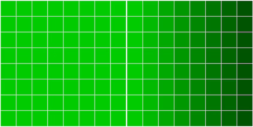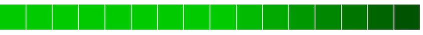 Первая строка, столбцы с первого по девятый - #00CC00. Первая строка, десятый столбец - #00BB00. Первая строка, одиннадцатый столбец - #00AA00. Строка первая, столбец двенадцатый - #009900. Первая строка, тринадцатый столбец - #008800. Первая строка, четырнадцатый столбец - #007700. Первая строка, пятнадцатый столбец - #006600. Первая строка, шестнадцатый столбец - #005500.